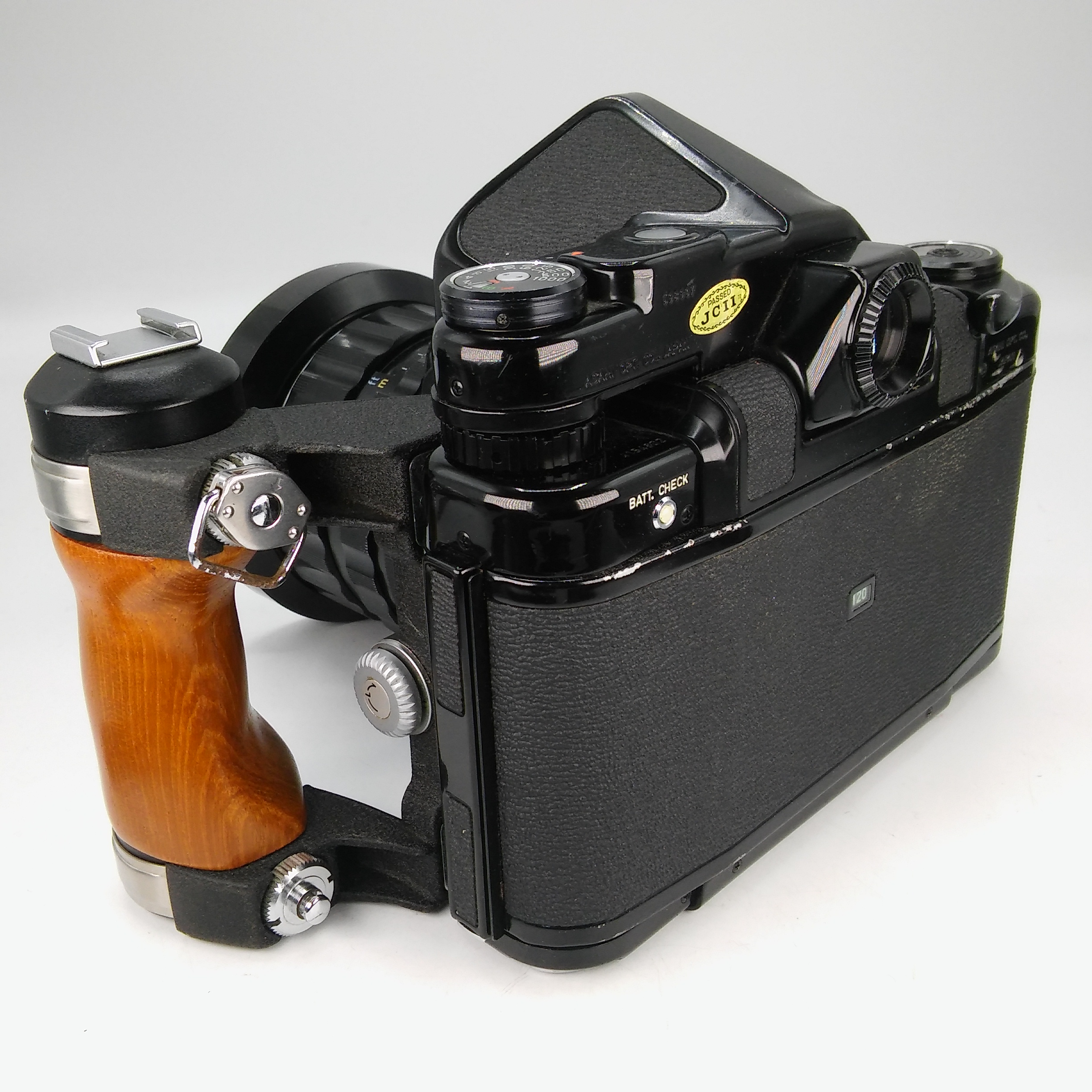 BUONISSIME CONDIZIONI, MACCHINA COMPLETA DI IMPUGNATURA IN LEGNO E GANCI (2) PER TRACOLLA, OBIETTIVO CON PARALUCE.